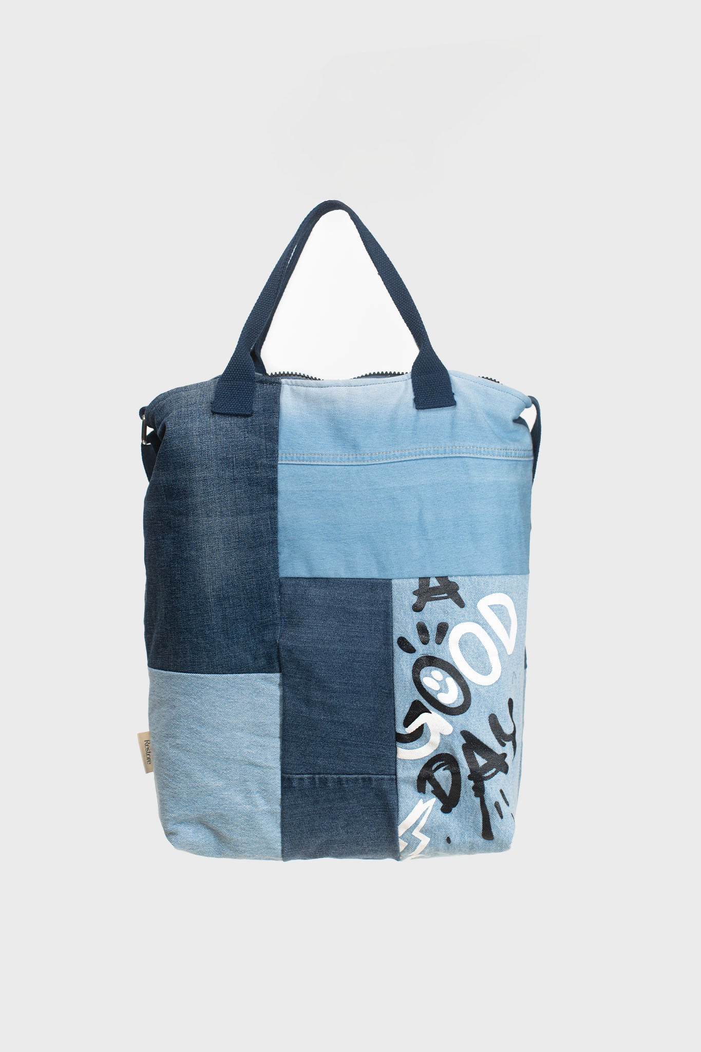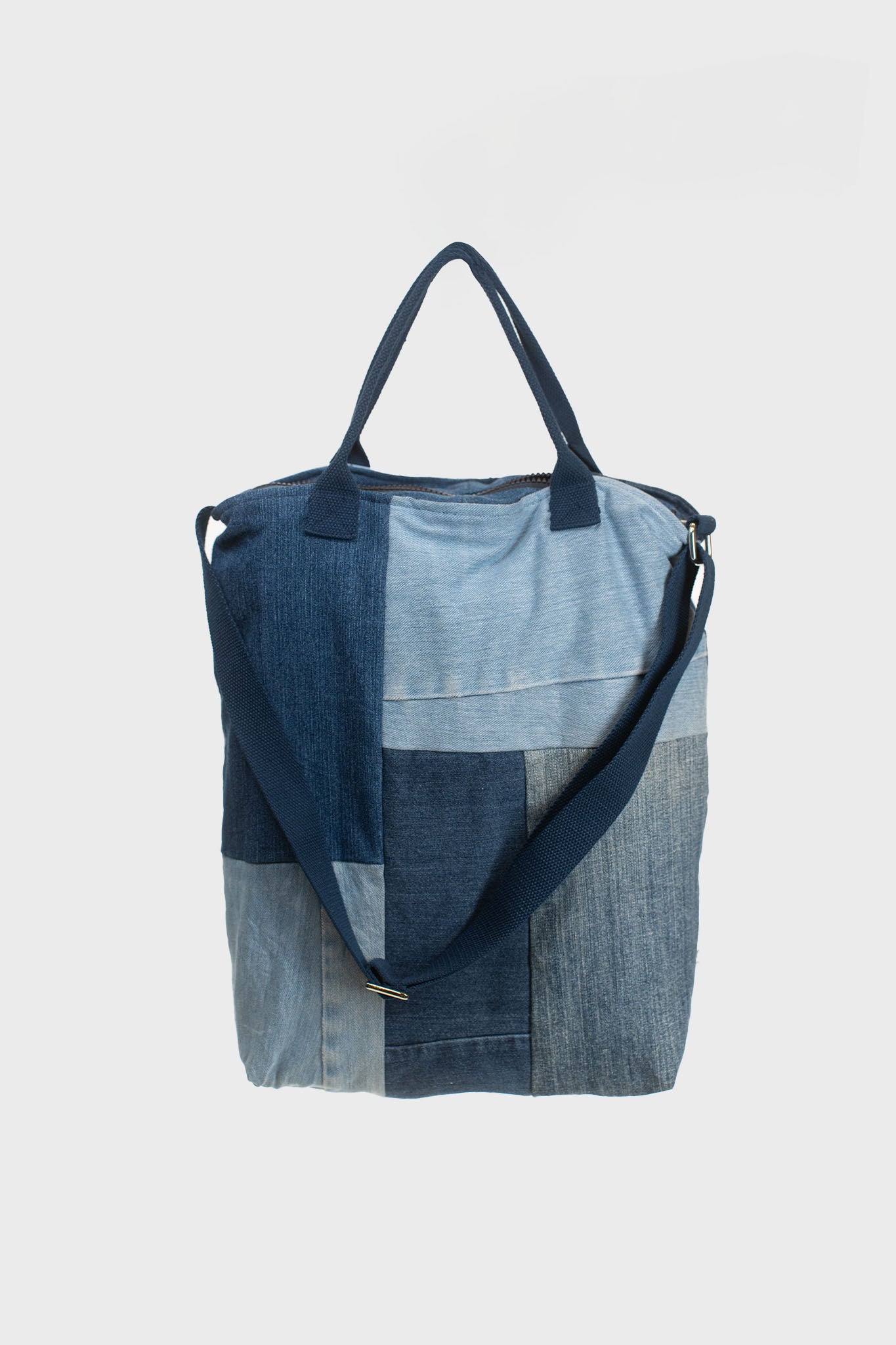 Made from upcycled denim apparel, each bag is one of a kind, featuring a unique mix of light and dark denim shades.