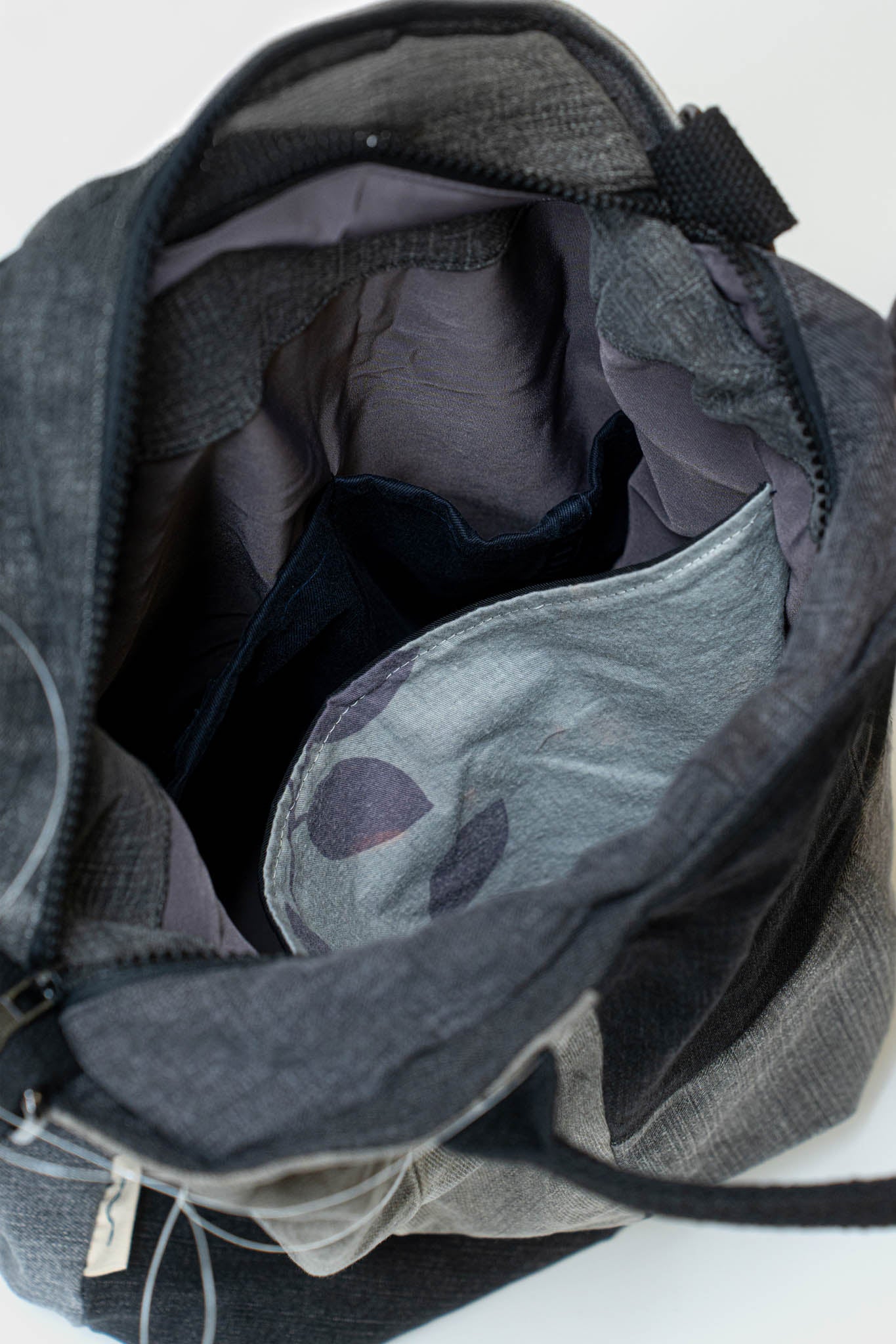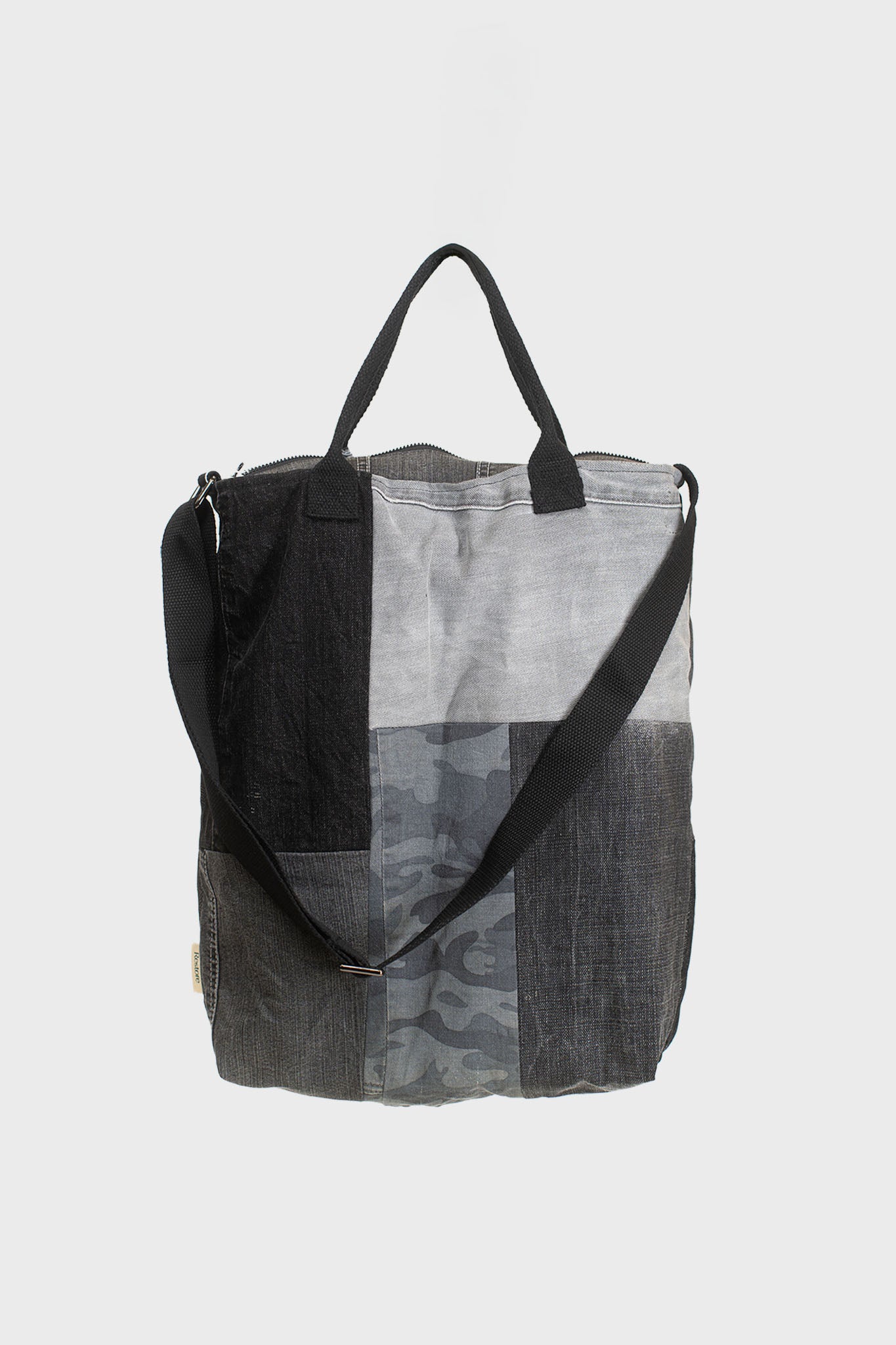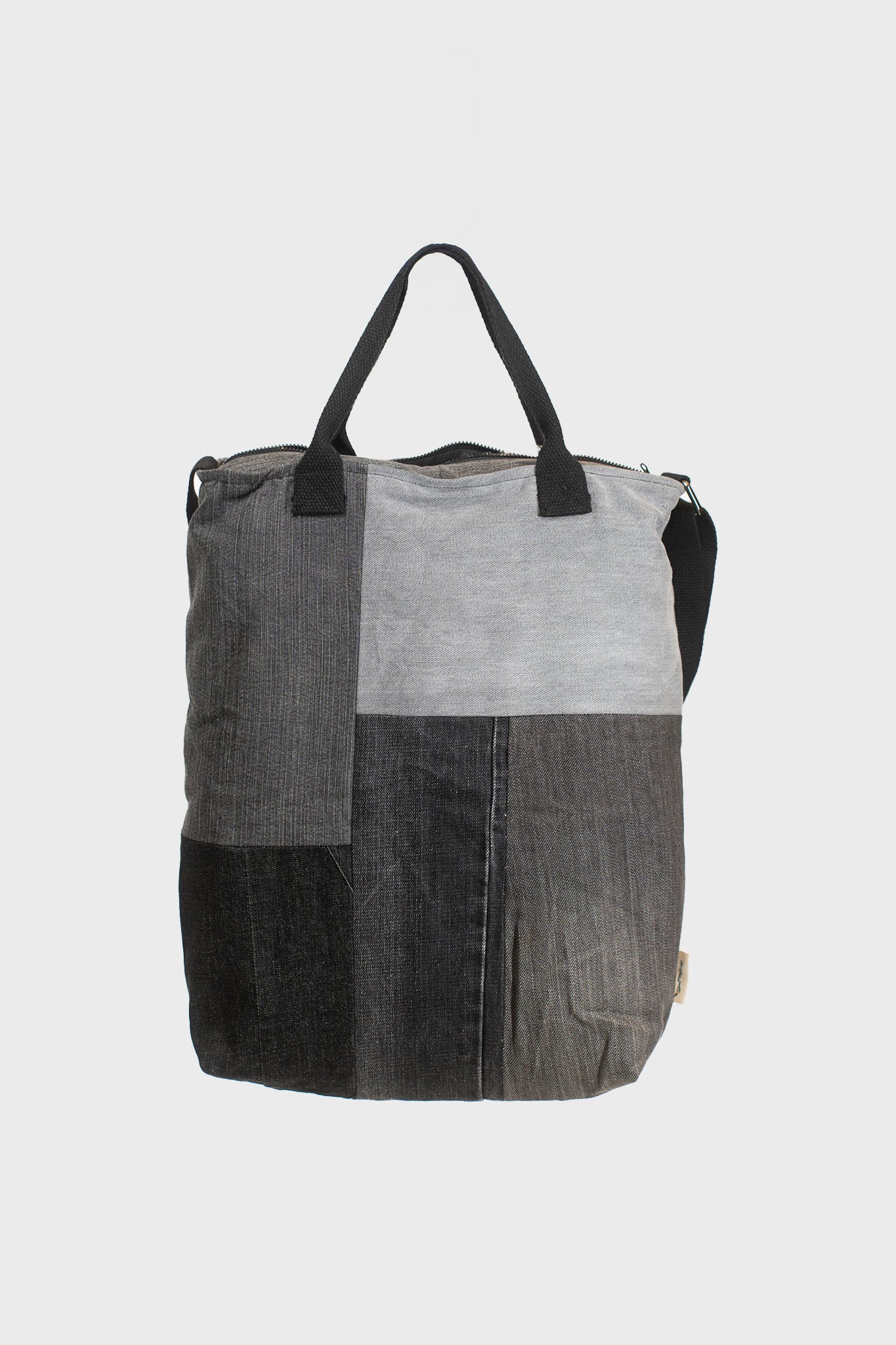 Made from upcycled denim apparel, each bag is one of a kind, featuring a unique mix of light and dark denim shades.