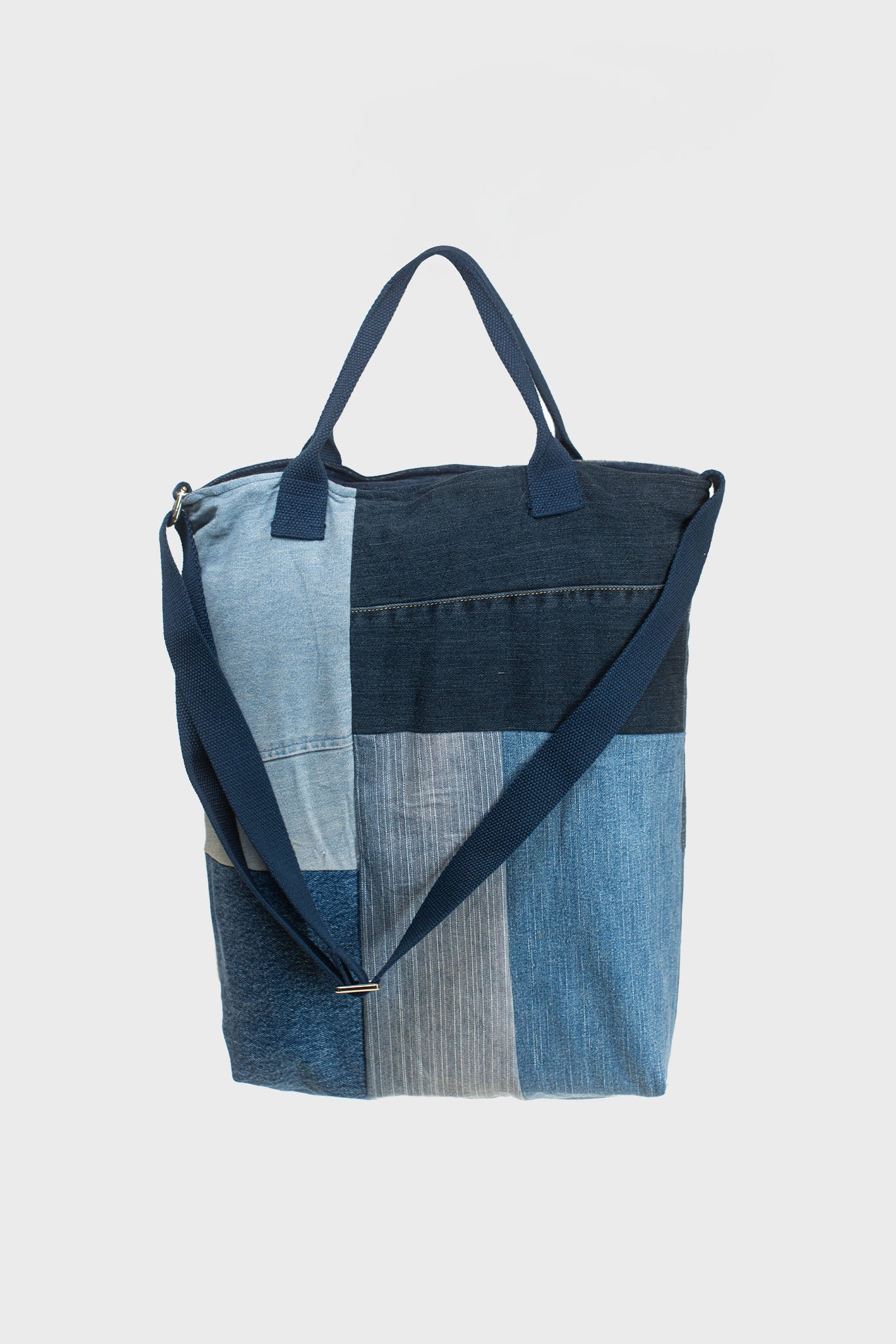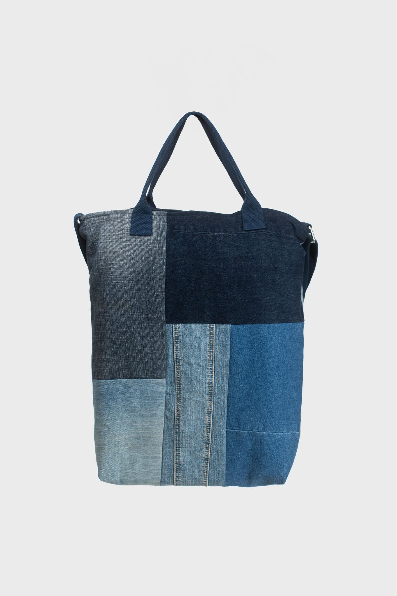Made from upcycled denim apparel, each bag is one of a kind, featuring a unique mix of light and dark denim shades.