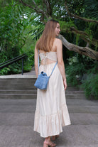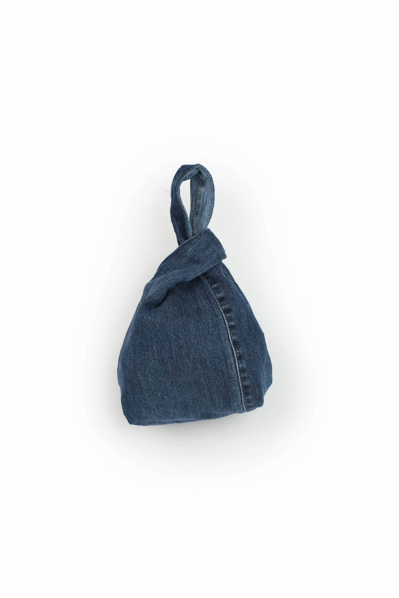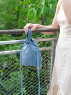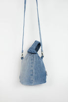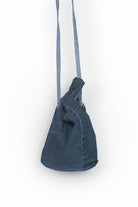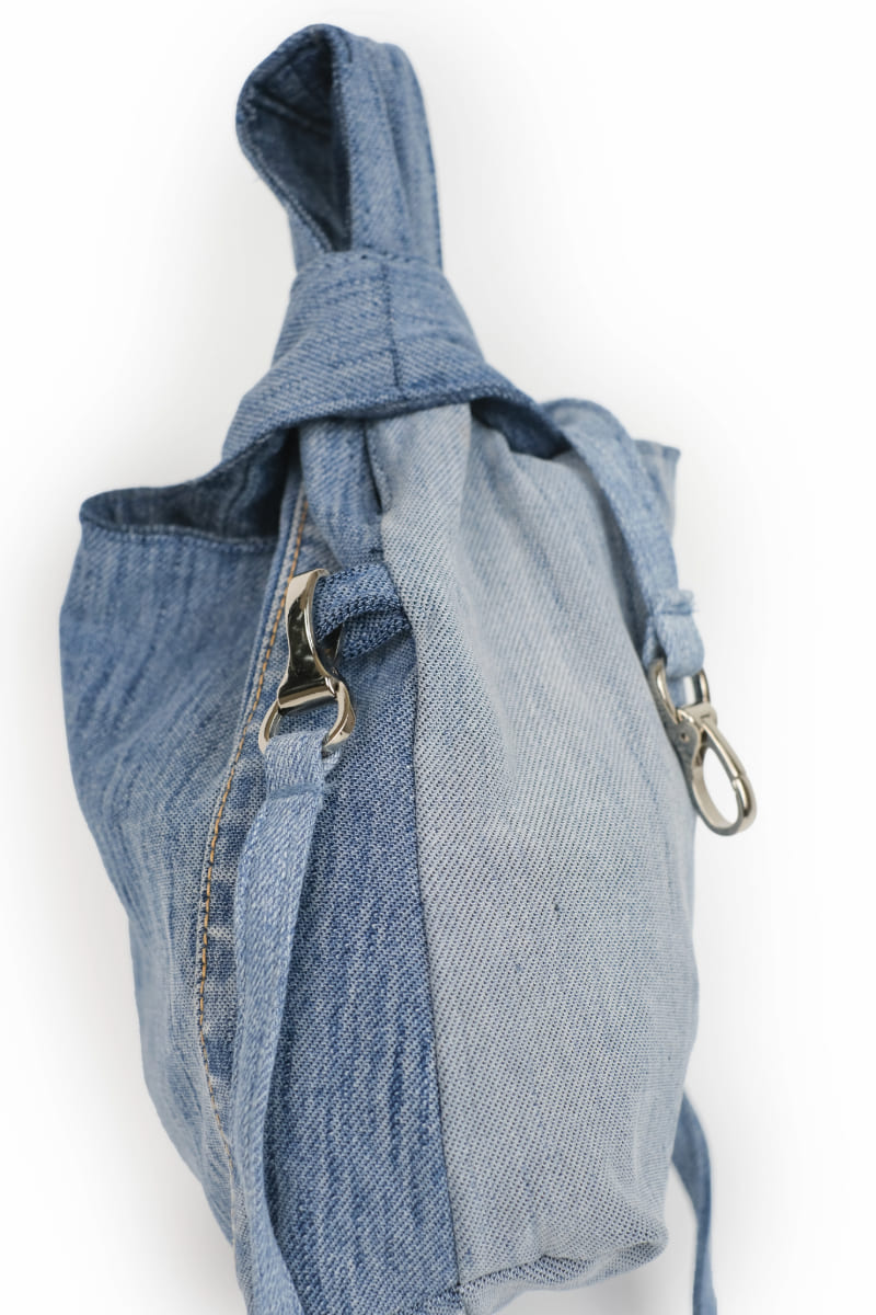Made from upcycled denim apparel, each bag is unique and may vary slightly from the images shown, with a mix of light and dark denim shades.