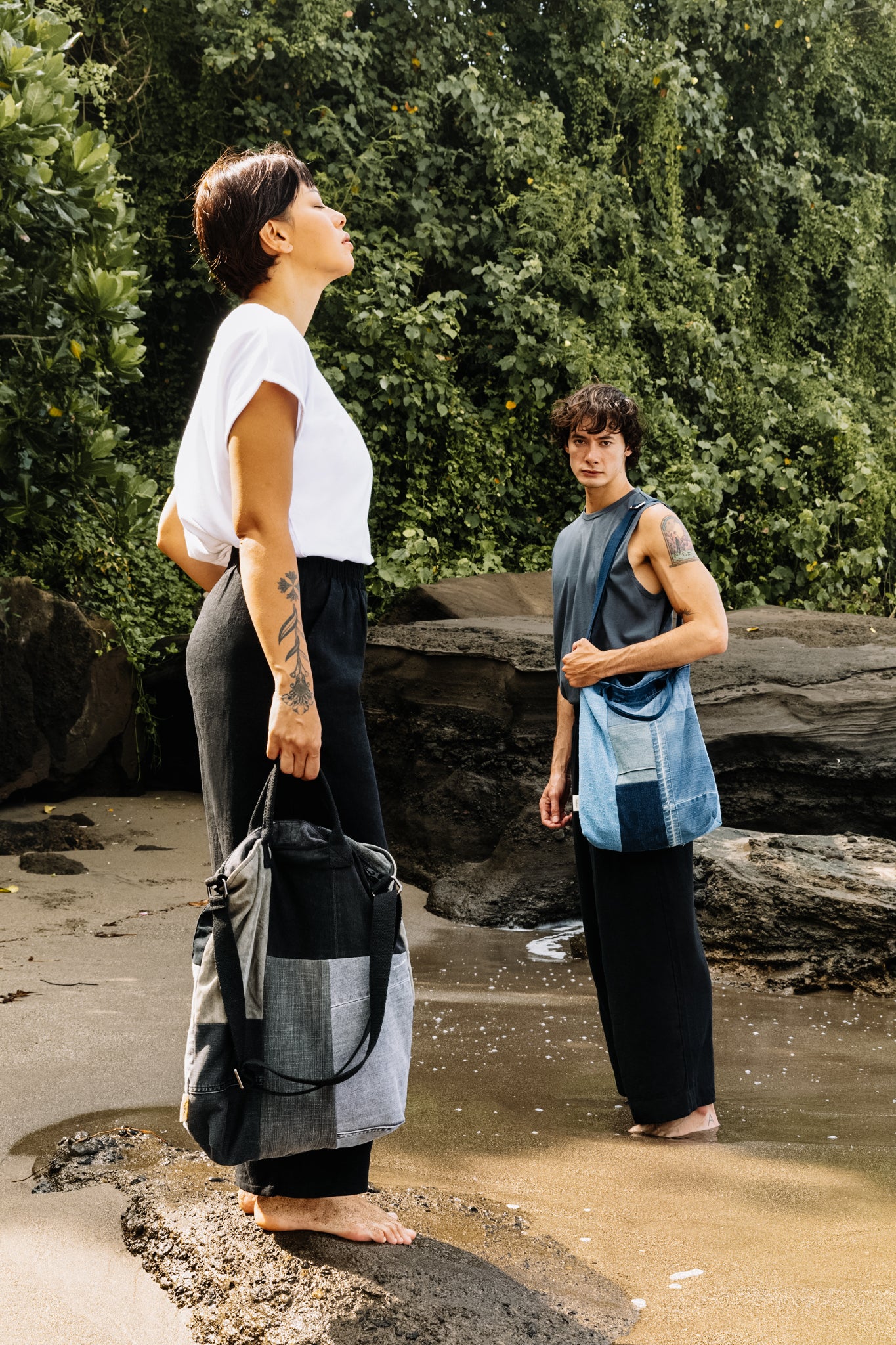 Made from upcycled denim apparel, each bag is one of a kind, featuring a unique mix of light and dark denim shades.