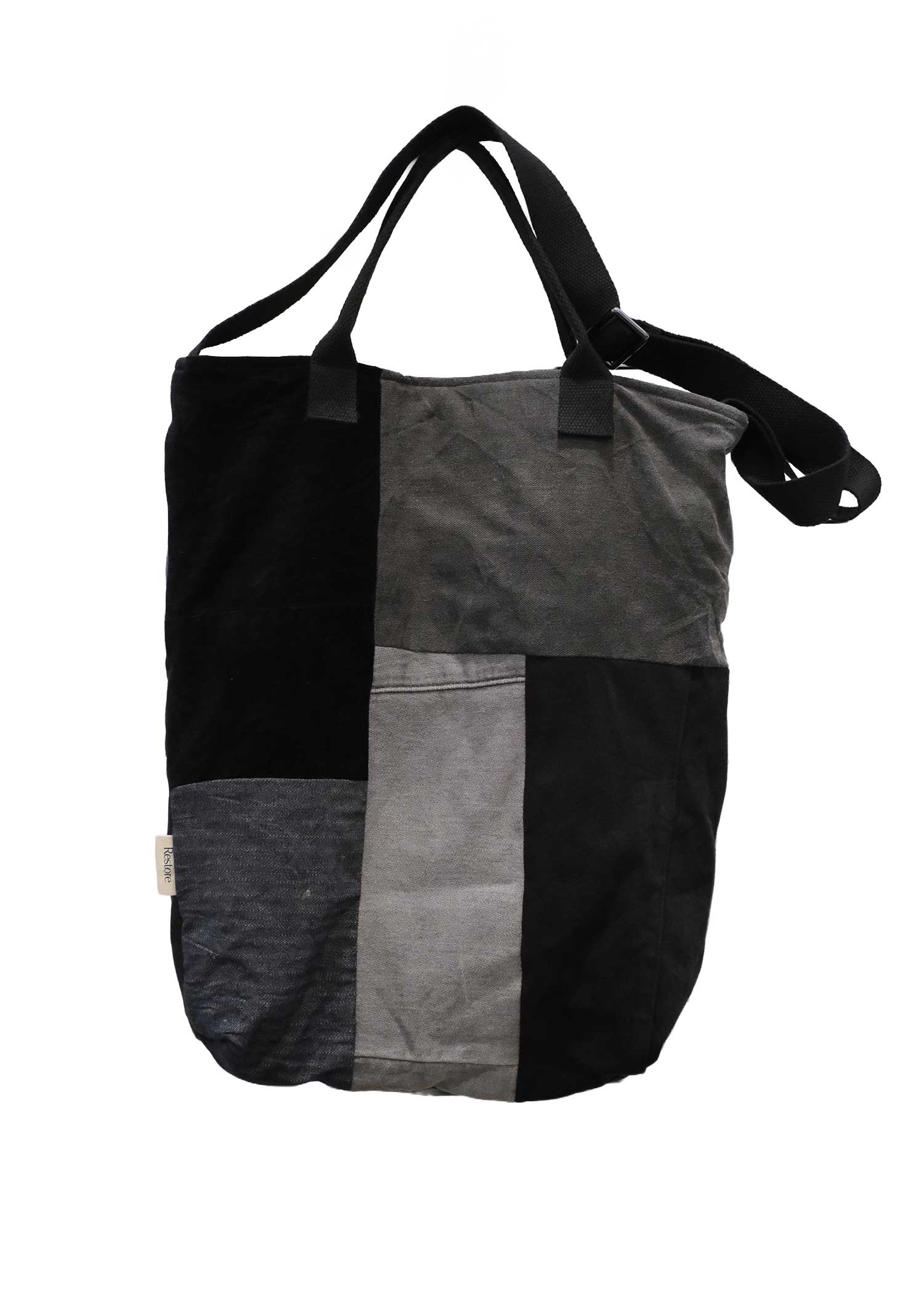 Made from upcycled denim apparel, each bag is one of a kind, featuring a unique mix of light and dark denim shades.