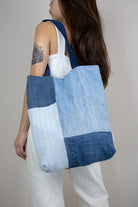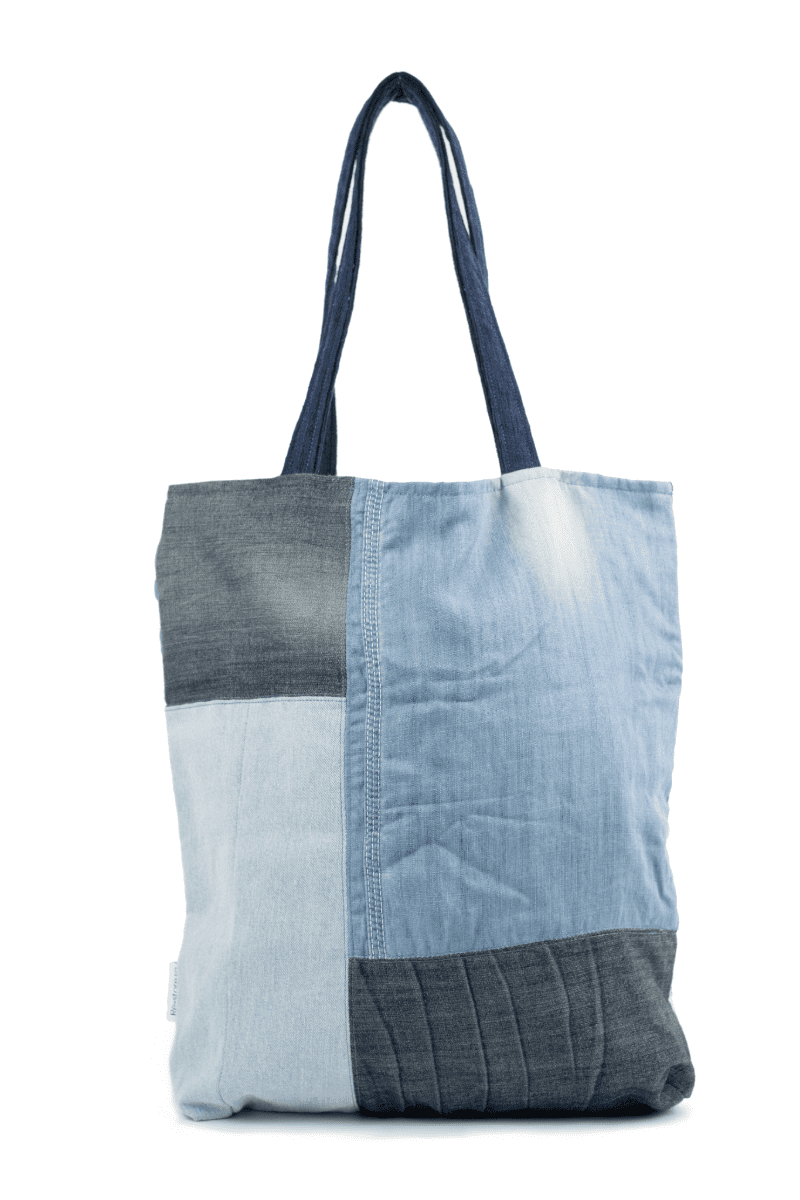 Made from upcycled denim apparel, each bag is one of a kind, featuring a unique mix of light and dark denim shades.